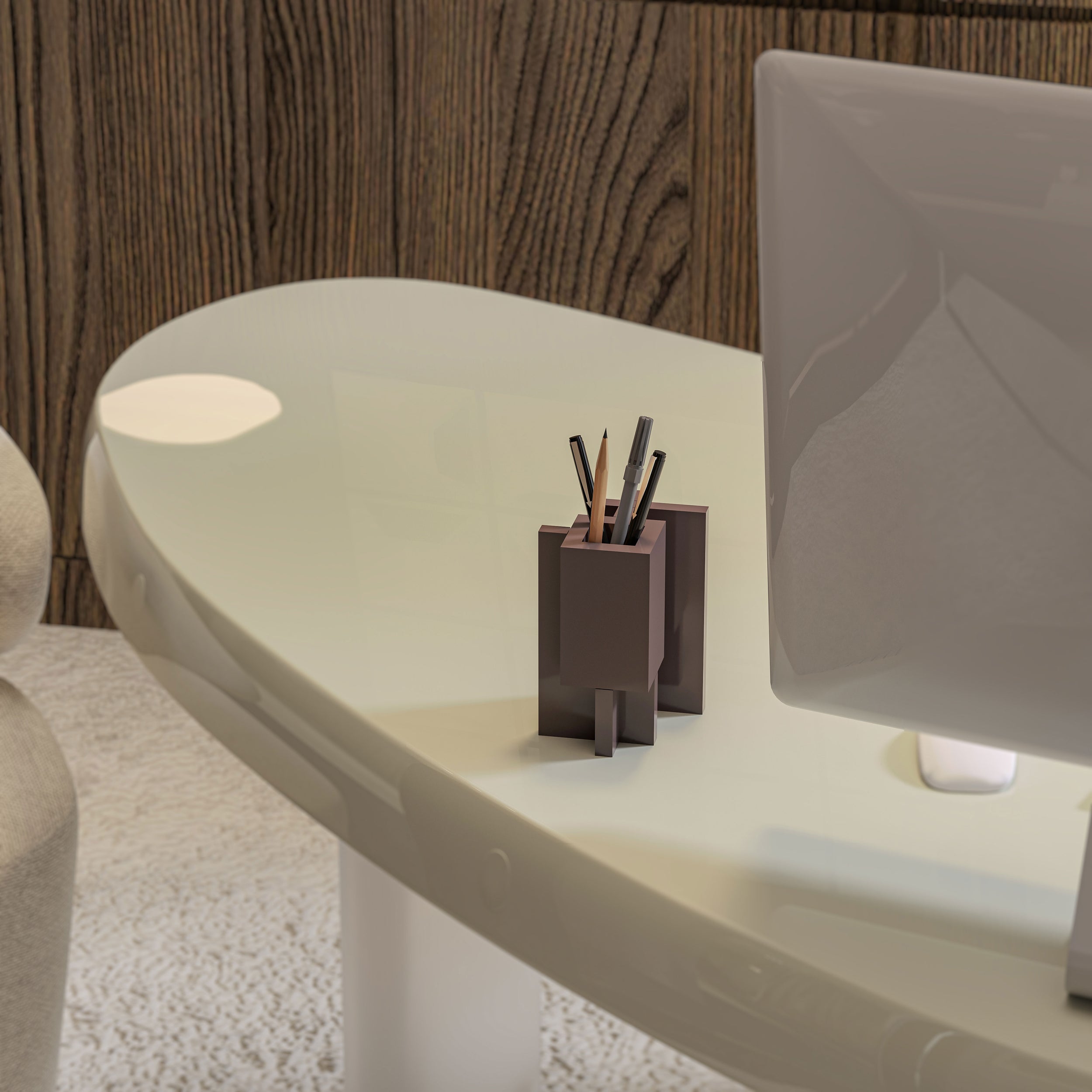 Nars Atelier’in yeni koleksiyonuna ait bu kalemlik, geometrik formu ve yalın çizgileriyle modern minimalizmi masaüstüne taşır. Düzenli ve şık yapısıyla çalışma alanlarına sofistike bir sadelik katar.
