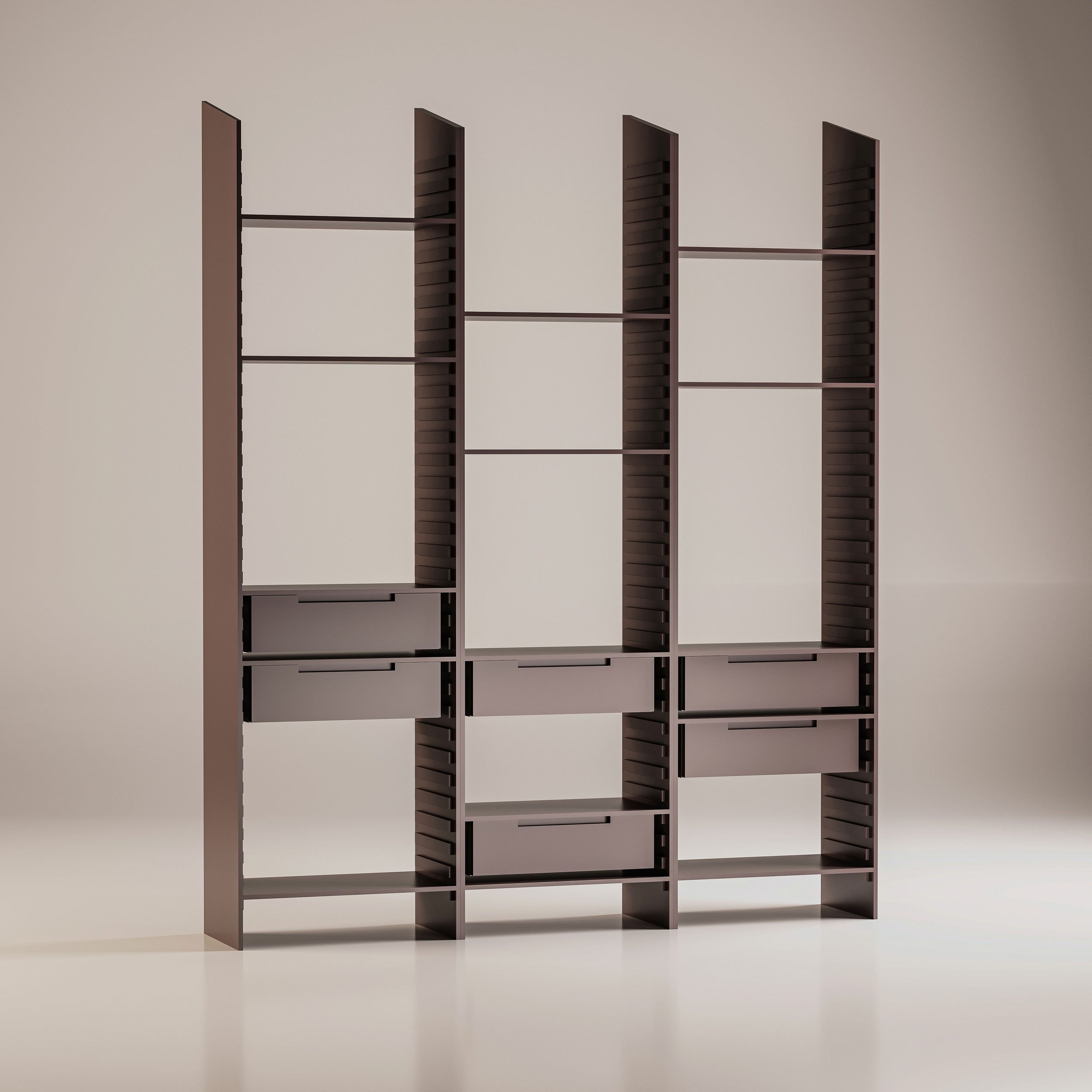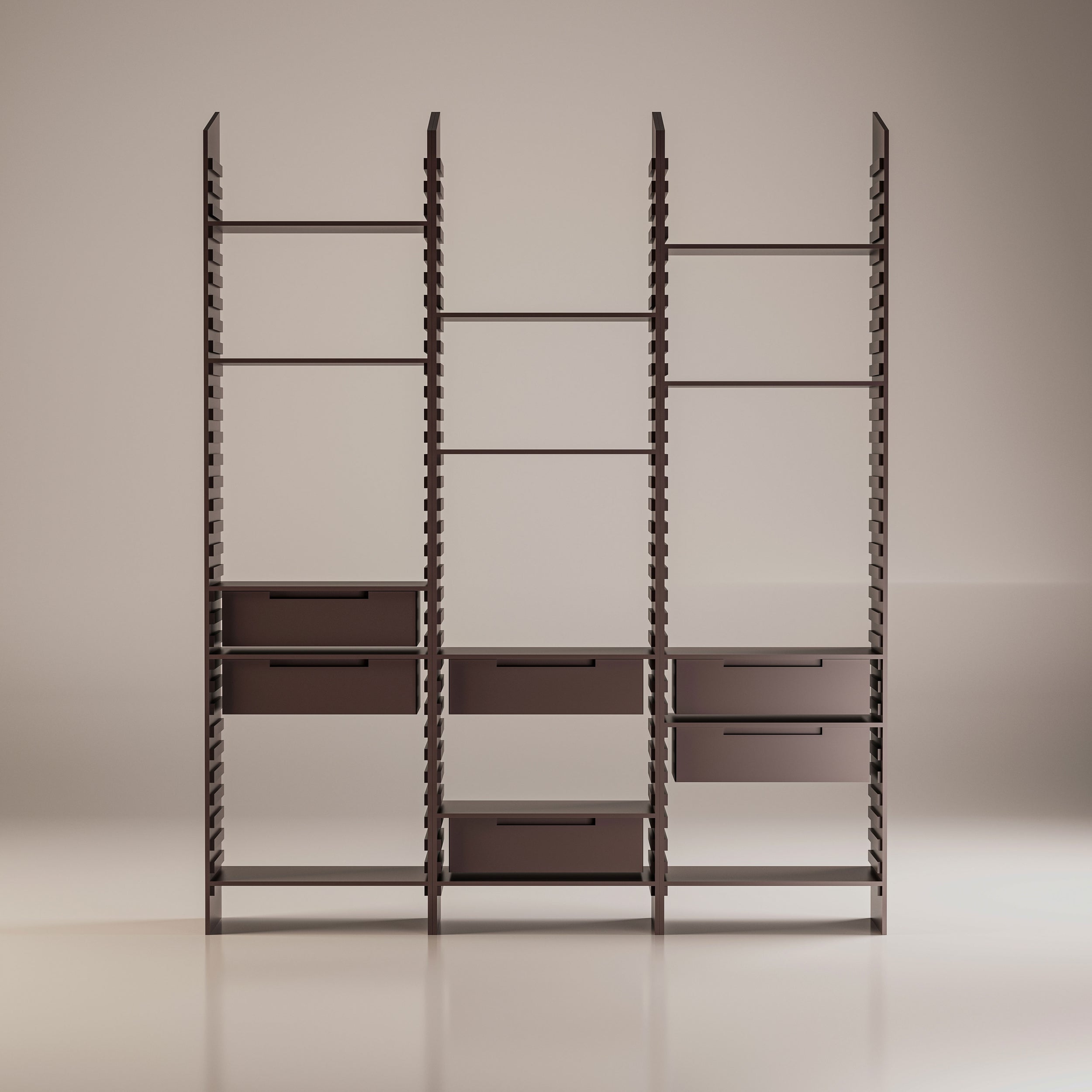 Nars Atelier’in Nexa koleksiyonuna ait bu kitaplık, üç modülün yan yana kullanımına örnektir. Birleşik olmayan bağımsız modüller, duvar uzunluğunuza göre çoğaltılarak farklı kombinasyonlarda kullanılabilir. Raf ve çekmece düzeniyle hem estetik bir görünüm hem de işlevsel depolama sunar.