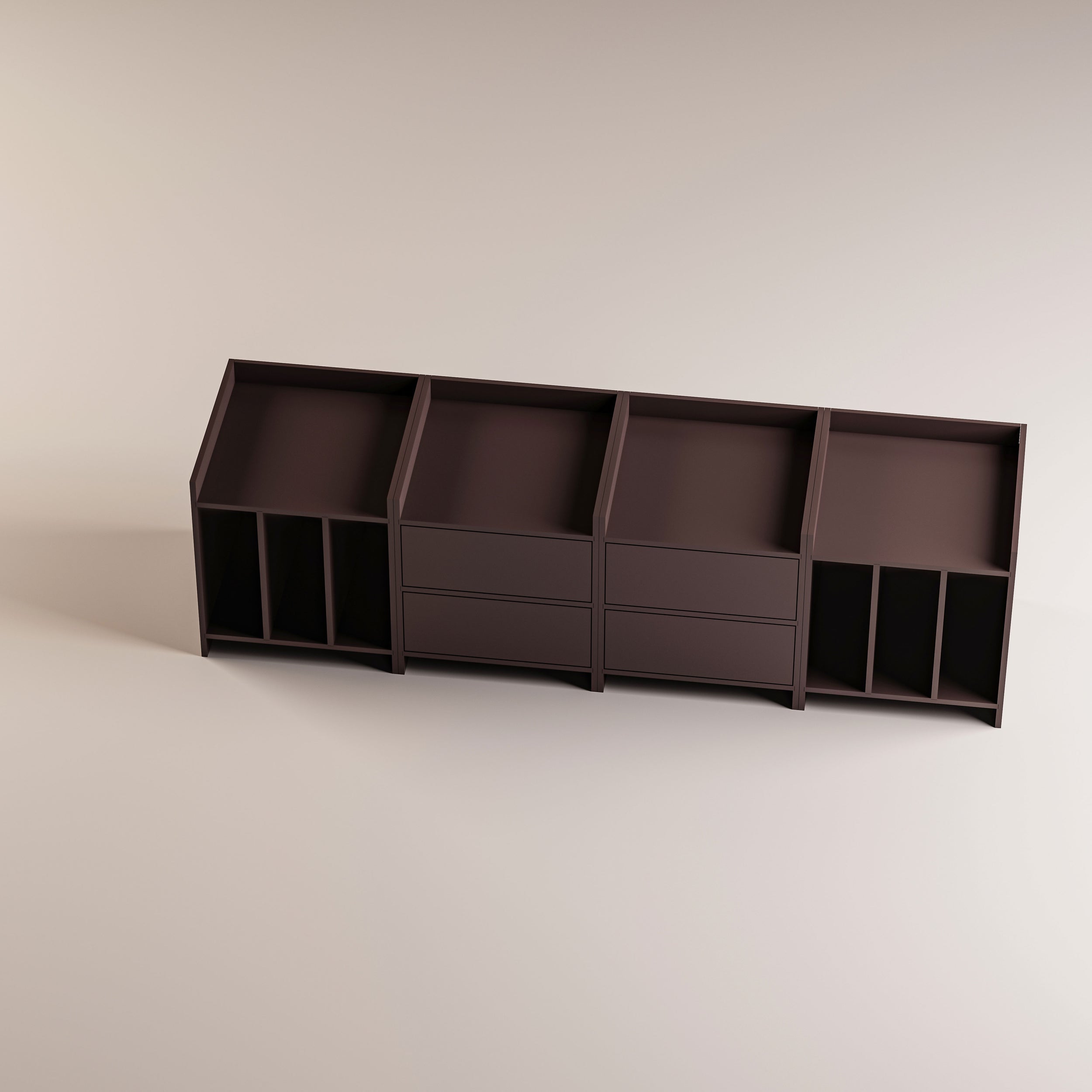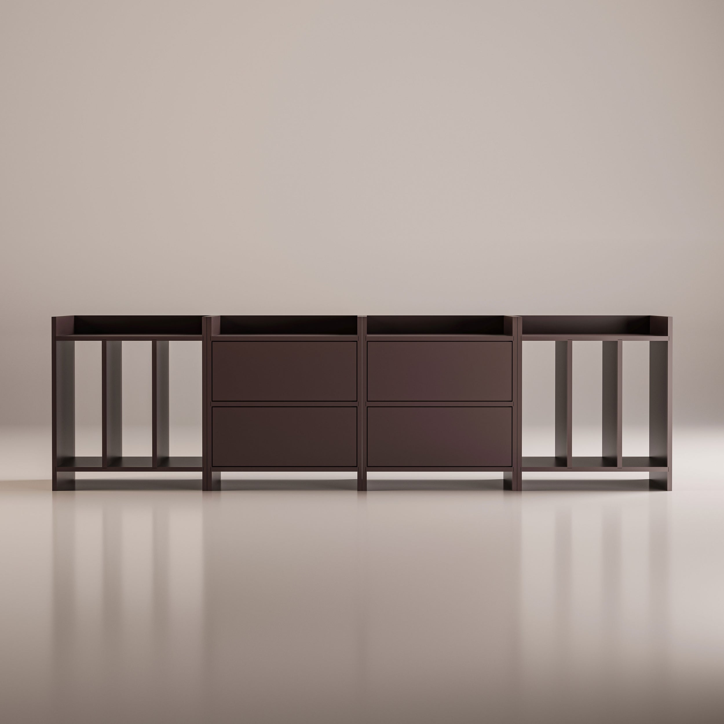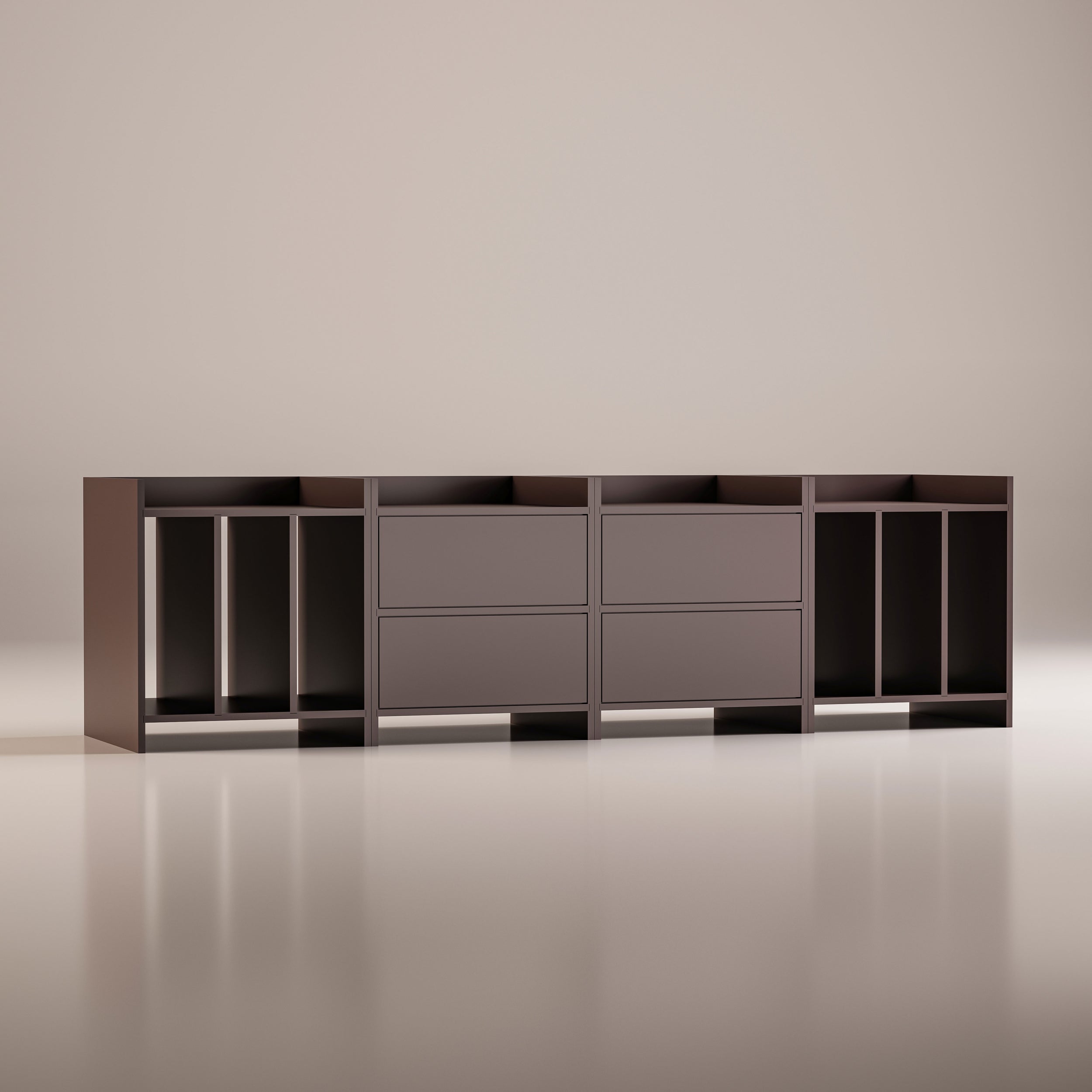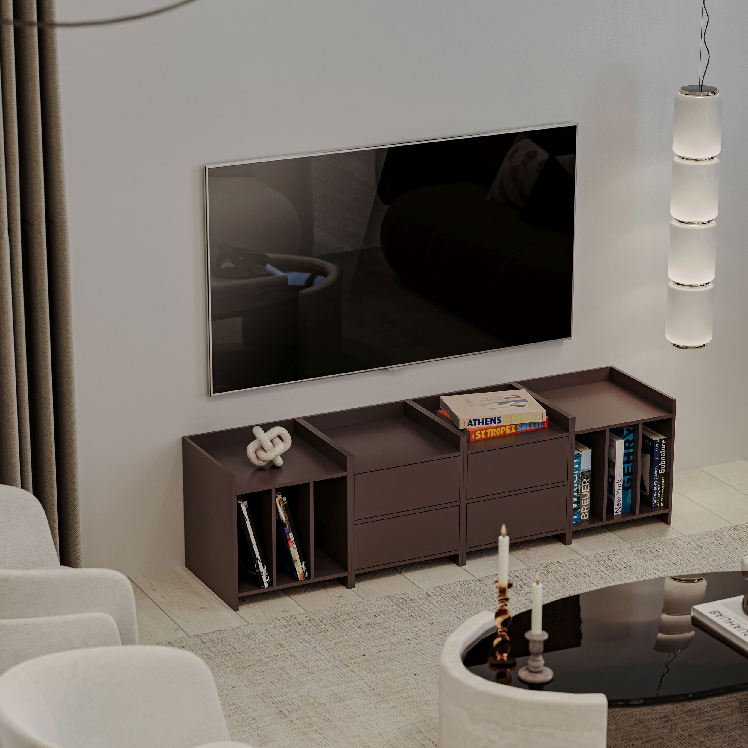 Bu dört modüllü TV ünitesi, işlevsellik ve estetiği dengeli bir biçimde bir araya getirir. Çekmeceler gizli depolama alanı sağlarken, açık bölümler dekoratif objeler veya medya ekipmanları için sergileme imkânı sunar. Çağdaş tasarımıyla mekânın atmosferine modern bir sadelik katar.
